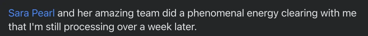 Sara Pearl and her amazing team did a phenomenal energy clearing with me that I'm still processing over a week later.